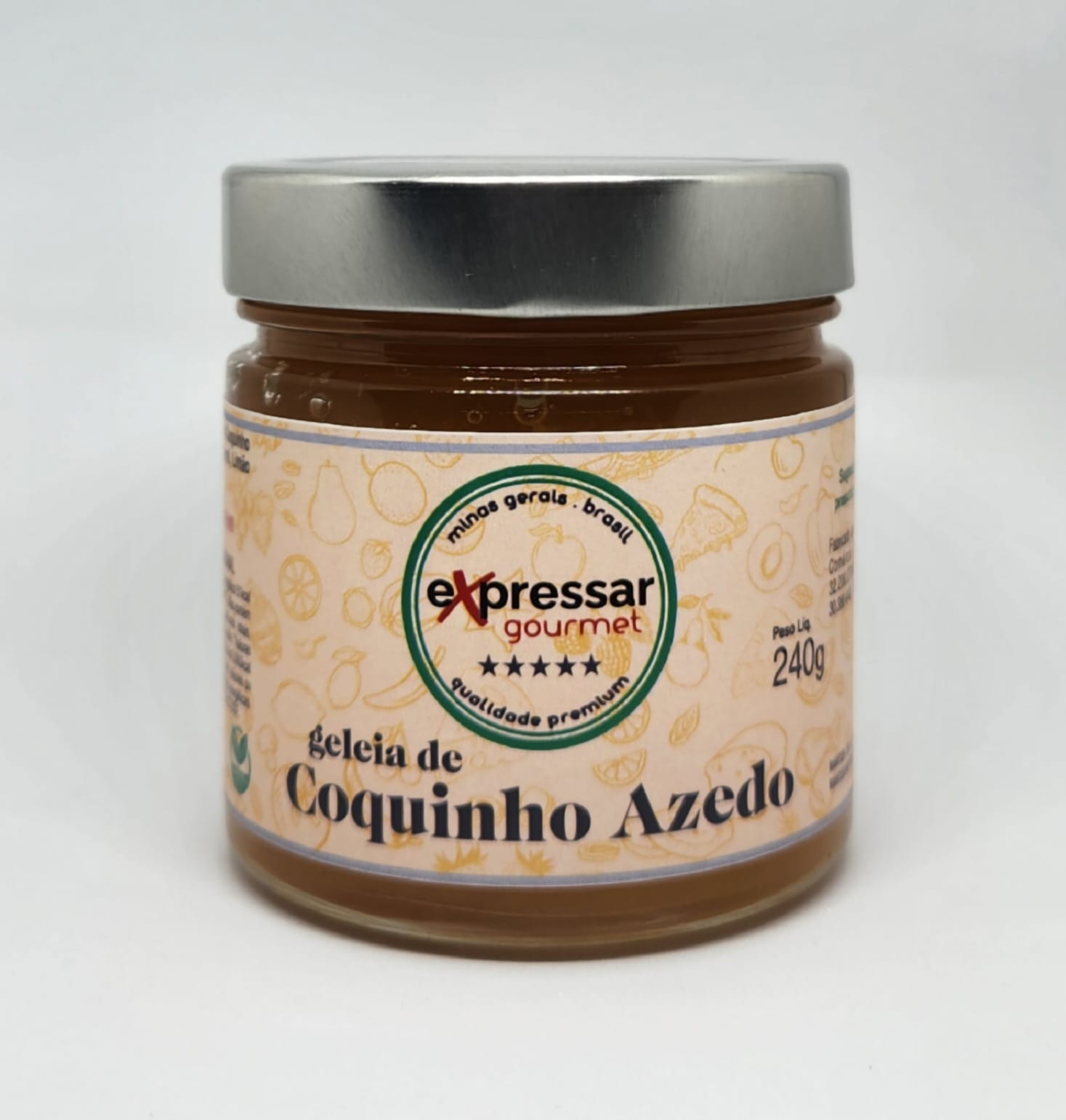 Geleia produzida da polpa do Coquinho Azedo. De textura leitosa e sabor suave e com adstringência marcante, ela harmoniza com carne vermelha, suínos e até massas. A gordura presente na polpa do coquinho está presente de forma residual nesta geleia de sabor único e exclusivo.